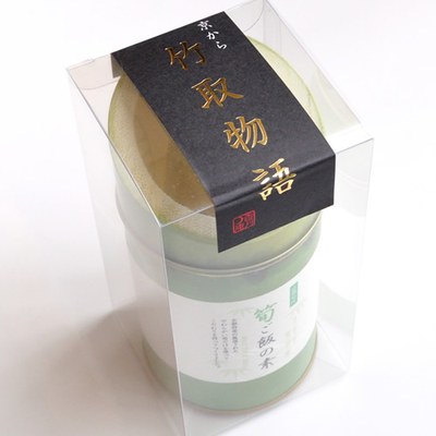 京都府産の筍だけを使用した「筍ご飯の素」を、竹をイメージした化粧缶入りでお届けします。(フタの天面は蓄光により、暗い場所で発光します)